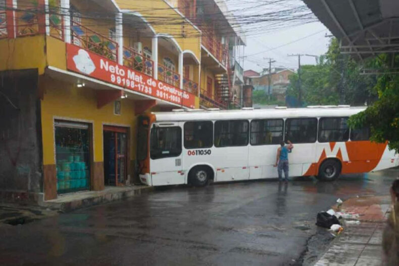 Um ônibus do transporte coletivo de Manaus atingiu uma loja de materiais de construção após perder o controle na tarde desta quarta-feira (3). O acidente ocorreu na rua Aristóteles Bonfim, no bairro Petrópolis, zona sul, e mobilizou moradores, comerciantes e equipes de apoio para a retirada do veículo e avaliação dos danos provocados no imóvel.